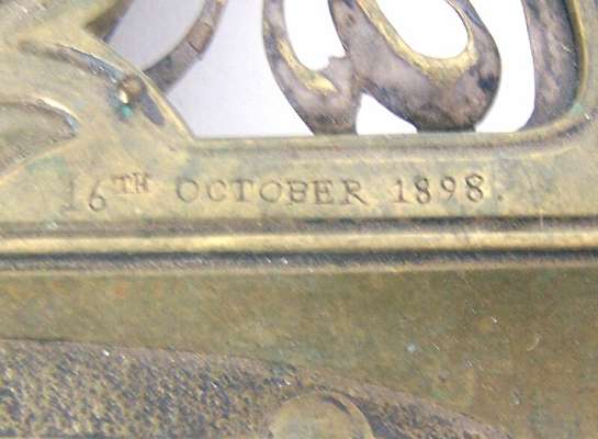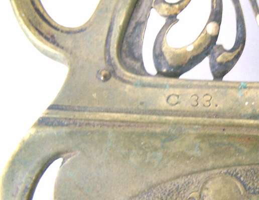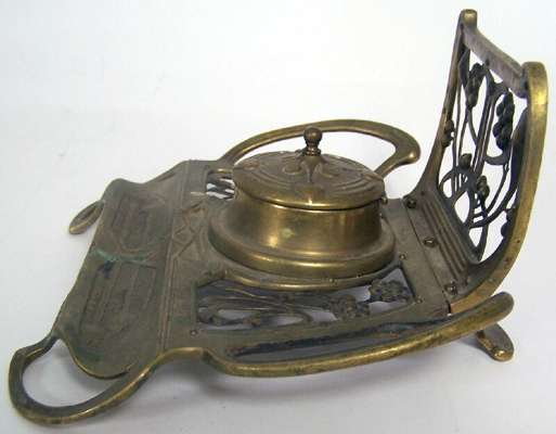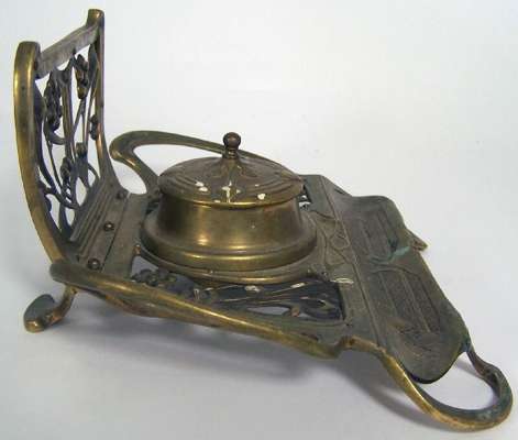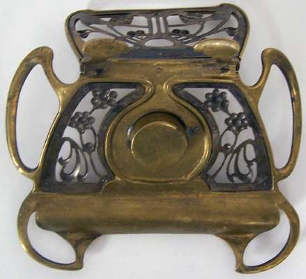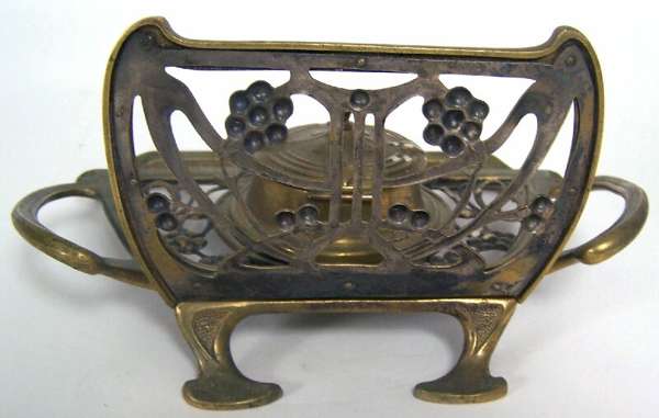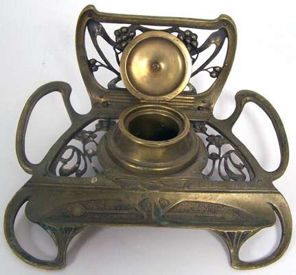 the ivory handled cane with an inset amethyst cabochon and gilt metal collar below the letters 'O W, C33' being Wilde's initials and his cell location: Block C, floor three, cell three, at Reading Gaol, 91cm high; together with a Seccessionist style brass inkwell marked 'c.33 - 16th October 1898' (the 16th October 1854 being the date of Wilde's birthday) of pierced foliate form decorated with vine scrolls and berries around a central lidded inkwell and pen tray, 20cm wide, 10cm high (2)