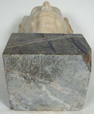 white marble, gazing forwards with pensive expression on a rectangular grey veined marble plinth