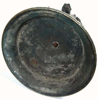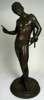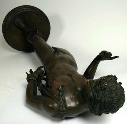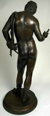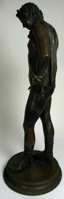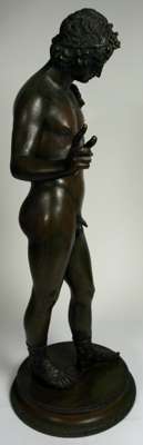 bronze, with green patination, the standing figure gazing downwards with an index finger raised and an animal skin sash over his left shoulder, on a foliate cast circular plinth base