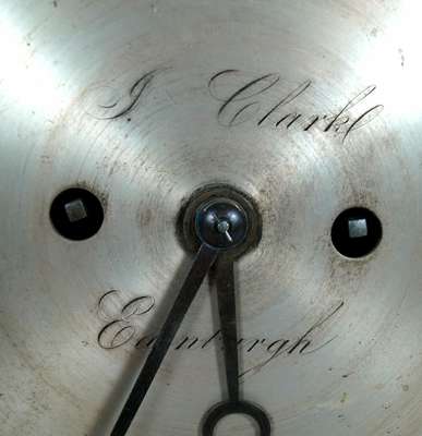 the lancet arched case with slender brass pilasters and boxwood lines flanking a silvered roman dial, signed J.Clark, Edinburgh, the sides with iron mask ring handles above tracery pierced panels, the twin fusee movement striking the hours on a bell, on brass ball feet