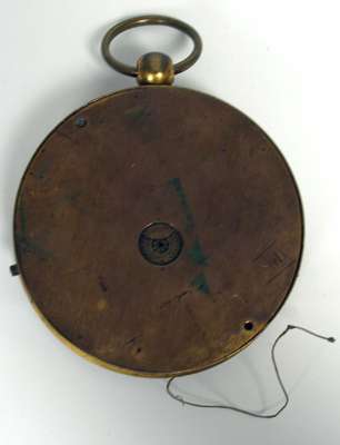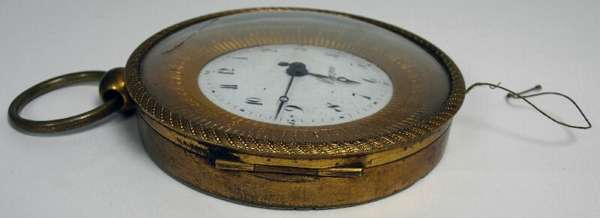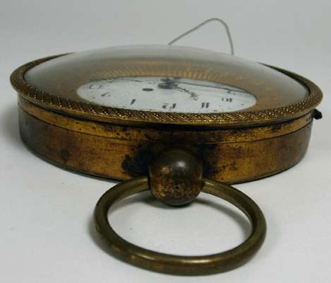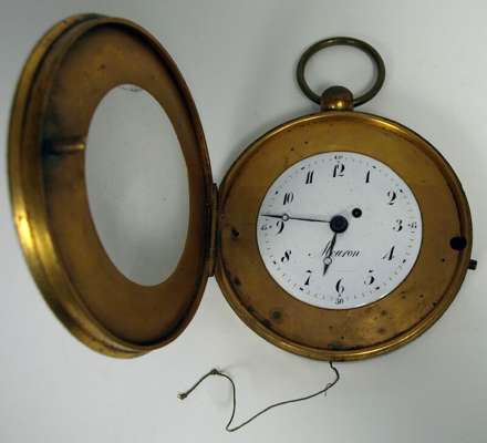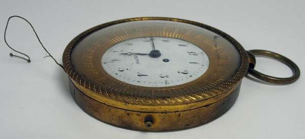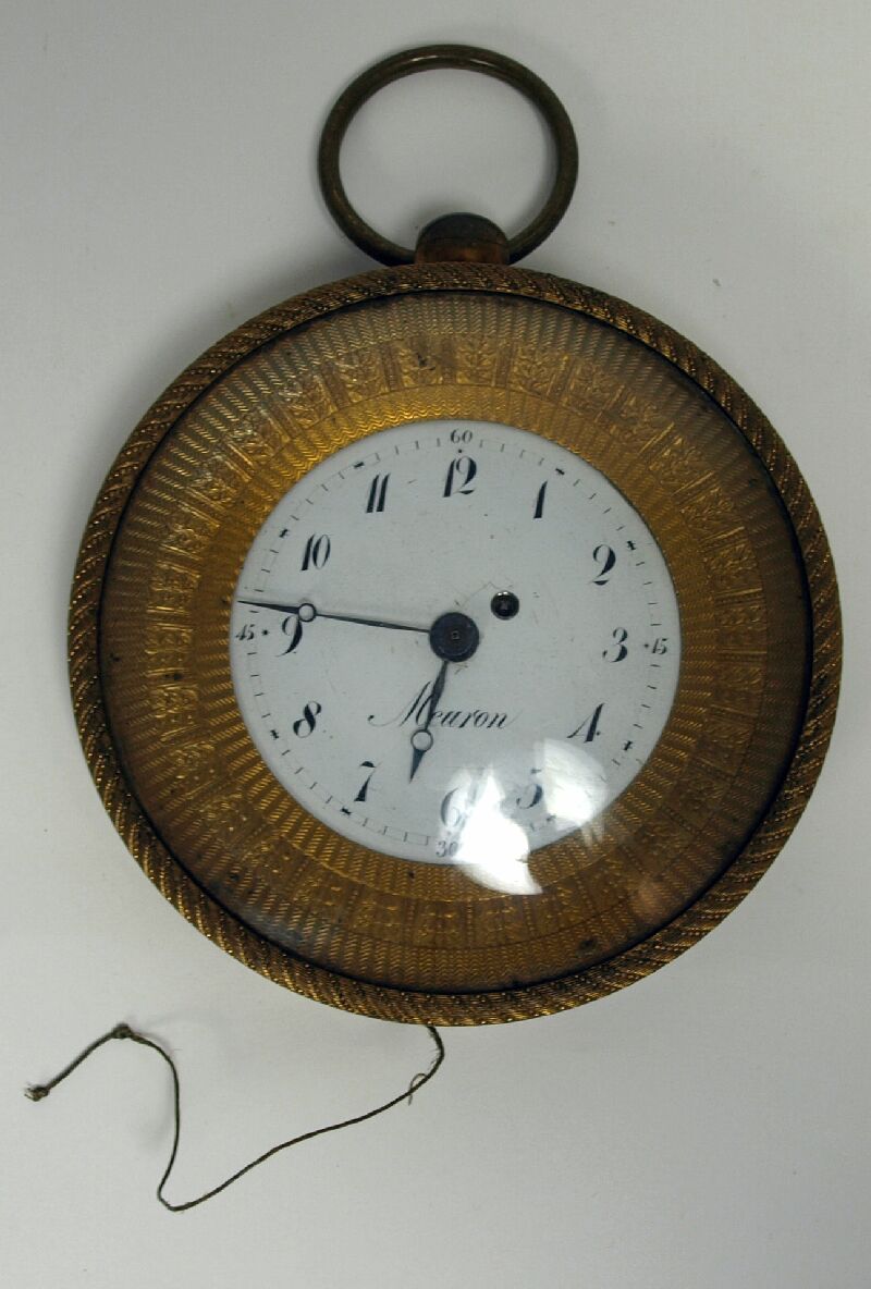 the circular glazed case with ring handle and broad engine turned bezel, the arabic enamel dial with single winding hole, signed 'Meuron'