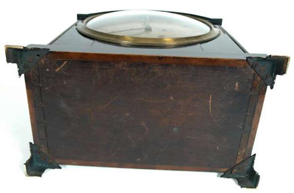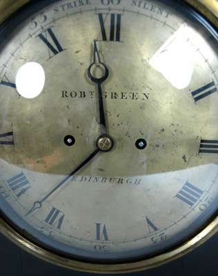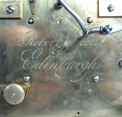 the silvered roman dial with subsidiary arabic chapters and 'strike/silent' lever, the twin fusee movement striking the hours on a bell, signed Robt. Green Edinburgh, the backplate similarly engraved, the arched rectangular brass framed case with fretted side panels and moulded plinth raised on ogee bracket feet