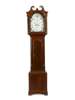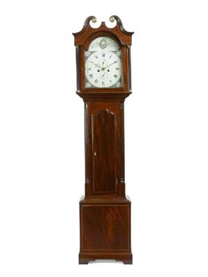 the twin train eight day movement with anchor escapement striking the hours on a bell, the swan-neck pediment above neo-classical faux verre eglomise dial with fan paterae around a Roman dial with subsidiary seconds and calendar dials, the maker's name indistinct (town possibly Doune/Dundee), the ogee arched trunk door between reeded quadrant corners, on a line inlaid apron and cut plinth base