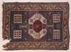 late 19th/early 20th century, the blue field with central ivory and red octagon medallion, flanked to each side by two hooked squares, within ochre serrated leaf and hooked pole border between pyramid bands