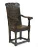 the panelled back with scrolled cresting and central thistle within an arcaded border, the downswept arms above plank seat with scroll carved rails, on straight baluster turned legs with block feet united by channelled perimeter stretchers
