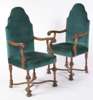 the arched backs above stuffover seats, in turquoise upholstery, flanked by outscrolling leaf carved arms on inverted baluster turned legs united by serpentine X-stretchers, on leaf-carved bun feet (2)