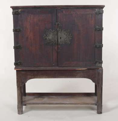 A late 17th/ early 18th century Iberian walnut cabinet, on later estate-built stand