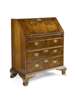 the fall enclosing a fitted interior with a well, short drawers and pigeon-holes around a central cupboard door above three graduated and lipped drawers with foliate engraved brass handles on ogee bracket feet