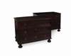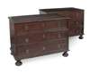 the rectangular tops each with cleated edges above three long sunken field drawers with brass loop handles, on bun feet (2)