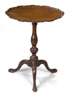 the circular top with a pie-crust edge, raised on a baluster turned column support ending in three cabriole legs with pointed pad feet