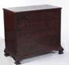 the top with moulded edge above four long graduated and cockbeaded drawers with brass brass drop handles, the upper drawer fitted with lidded compartments and pen tray around a central ratcheted slope, between blind fret carved canted angles, on ogee bracket feet