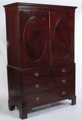 the projecting cornice above a pair of beaded oval panel doors enclosing slides and two short above two long graduated and cockbeaded drawers, on shaped bracket feet