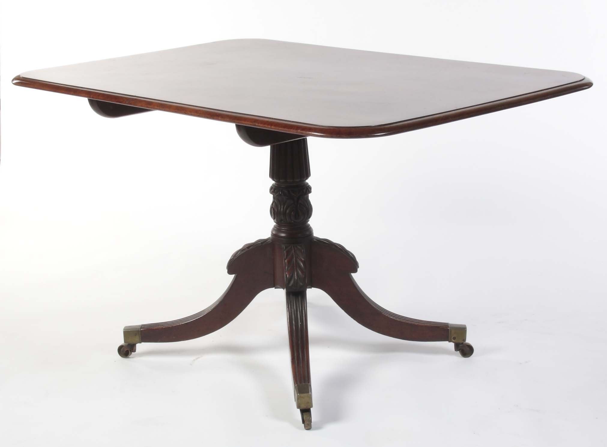 of small proportions, the rectangular tilt-action top with moulded edge above a reeded and acanthus carved column, on four hipped, reeded and leaf carved sabre legs ending in brass box castors