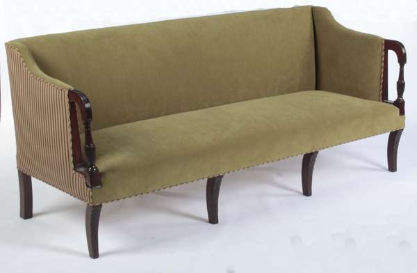 the upholstered rectangular back and seat between enclosed arms with reeded terminals on baluster supports, on front sabre legs, in green and red stripe upholstery