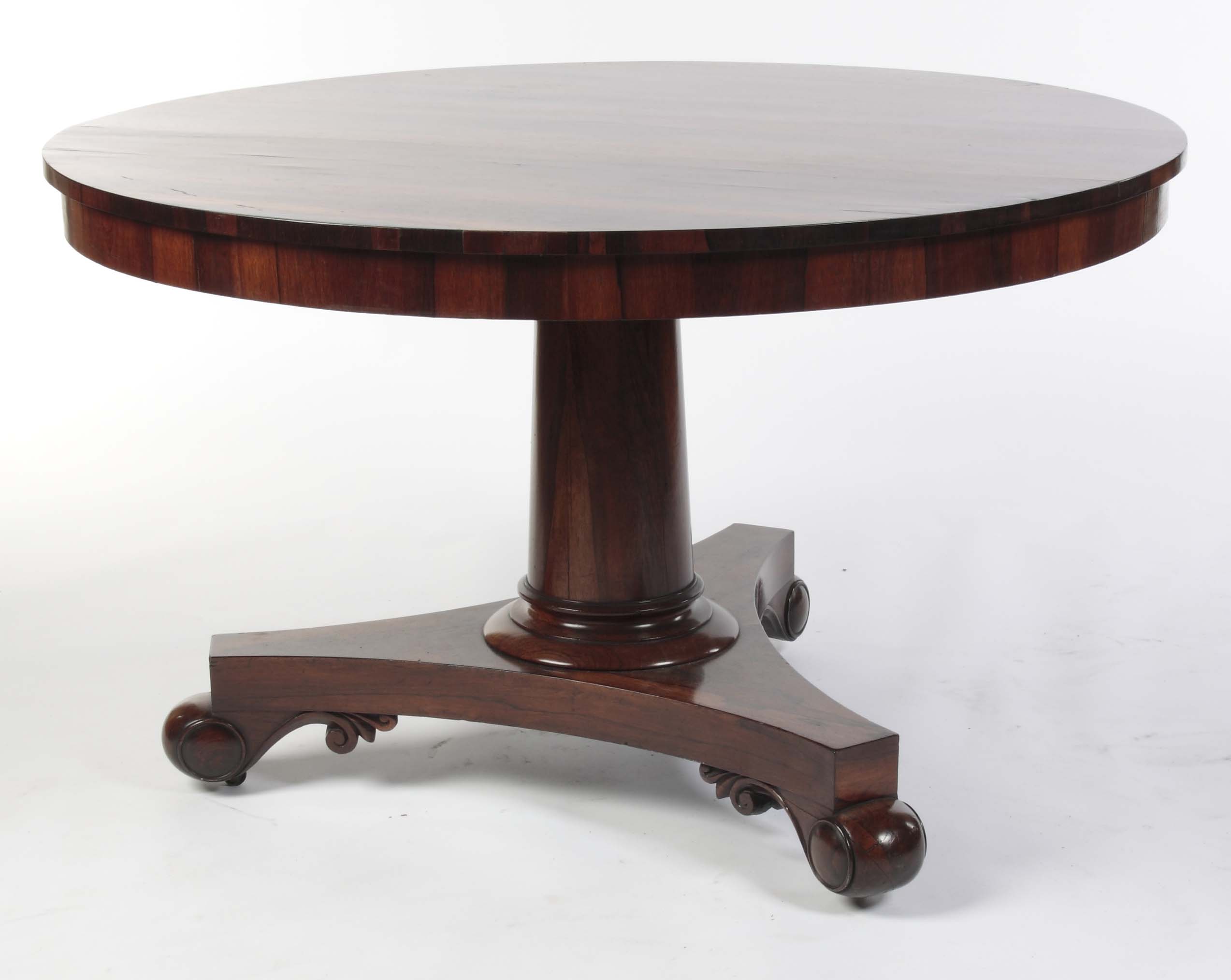 the well-figured circular top with plain frieze and tilt action on a tapering column and triform platform base ending in leaf carved scroll feet and castors