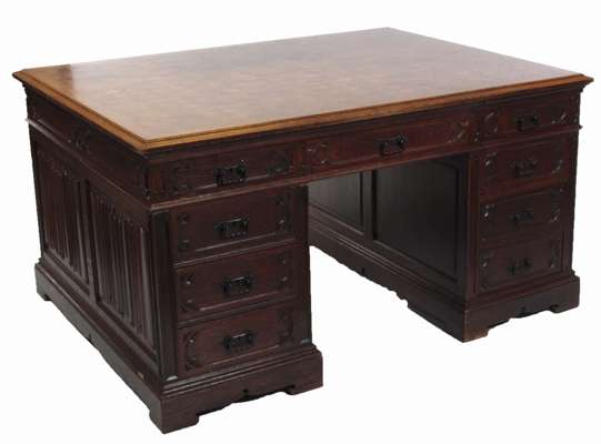 the rectangular top decorated with cube parquetry and moulded edge above three frieze drawers and a pair of slides to each side, the pedestals each with three opposing frieze drawers, on cut plinth bases, the whole decorated with sunken frieze tracery to the drawers and uprights and wrythen twist handles