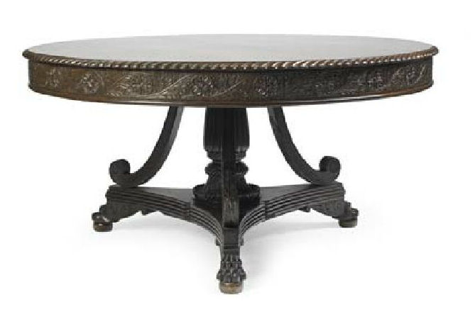 the circular top with gadrooned edge and rosette carved frieze interspersed with acanthus leaves, the central reeded pillar flanked by three reeded and stiff leaf carved scrolling uprights, on a reeded triform base raised on three voluted lion paw feet