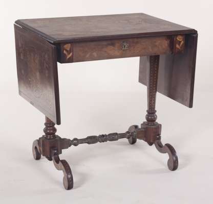 the rectangular top with central flower filled vase, each drop leaf decorated with a vignette of a female cellist, above a pair of opposing frieze drawers on faceted tapering supports and scrolling trestle base united by a baluster turned stretcher