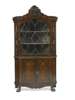 the arched and leaf-carved pediment above an astragal glazed door enclosing shaped and lined shelves above a pair of cupboard doors, on shaped apron and carved hairy paw feet