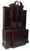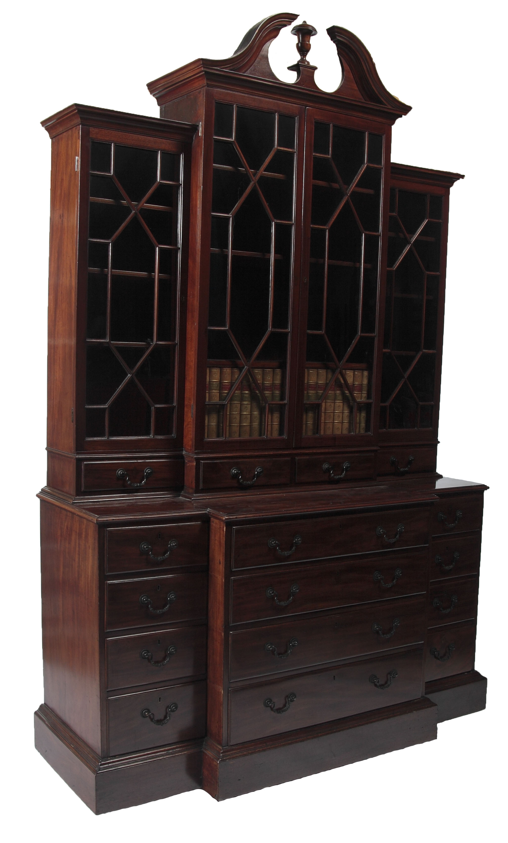 of small proportions, the swan-neck pediment with urn finial above four astragal glazed doors enclosing slotted shelves and a row of four frieze drawers, the lower part with a lipped frieze drawer enclosing a fall, open trays and concealed drawers above three further drawers flanked by two banks of four drawers with rocaille cast handles, locks stamped C & T London