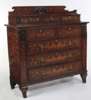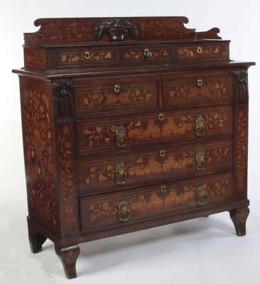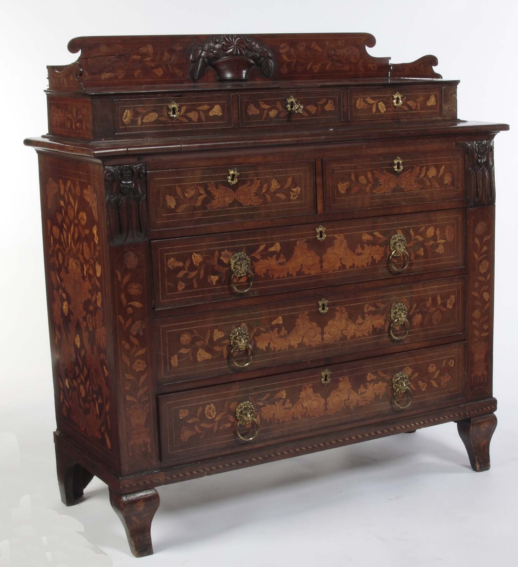 the three-quarter galleried back carved with a flower-filled jardiniere above three stage drawers and two short over three long graduated drawers with lion mask ring handles, on splayed square tapering feet, the whole inlaid with festoons and each side with a flower-filled urn