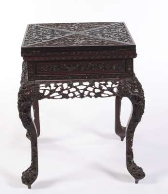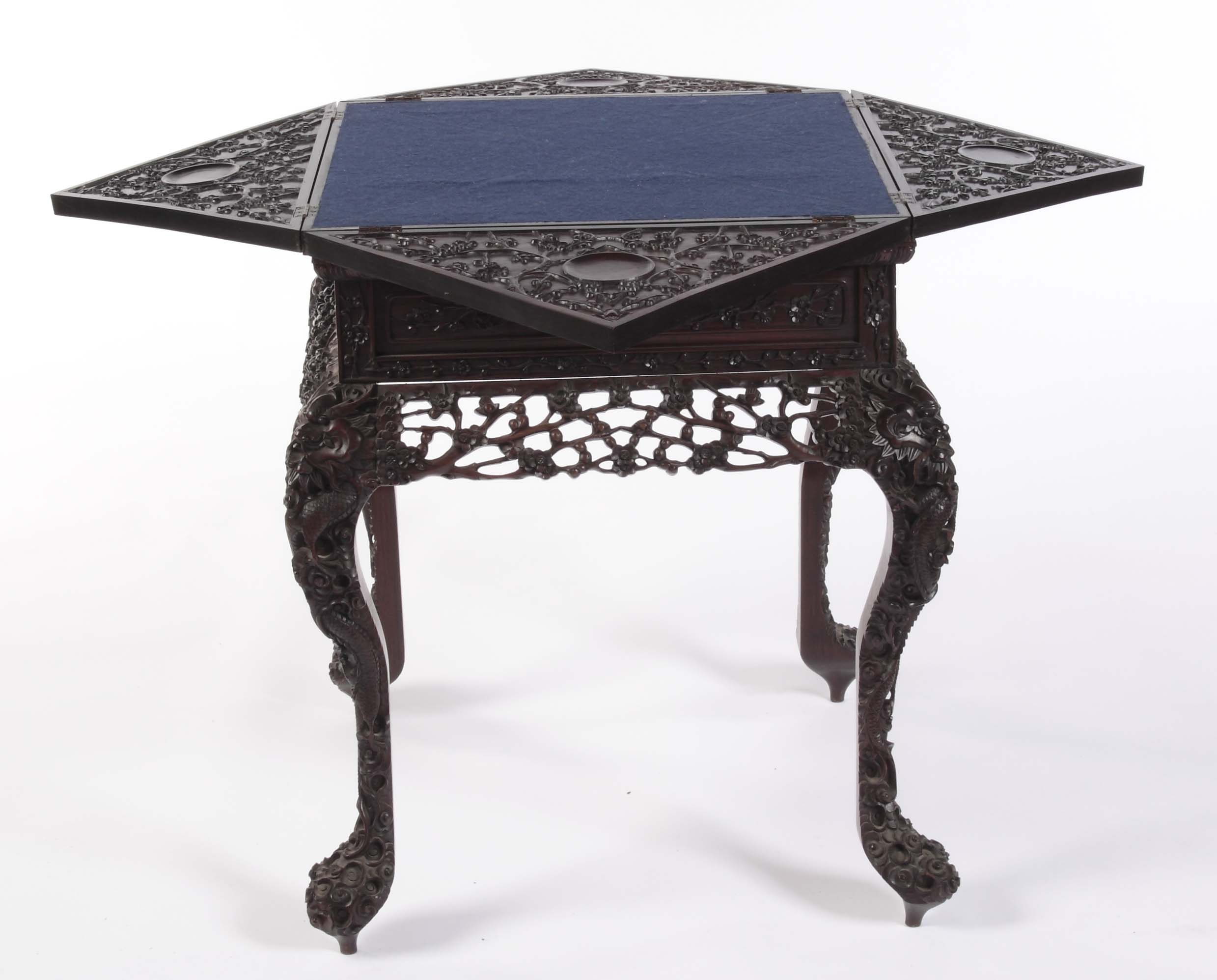 the square top with quartered leaves enclosing a baize inset above a frieze drawer, and pierced aprons, on dragon mask carved cabriole legs ending in foliate carved feet with brass castors, the whole profusely carved with flowering branches and vines