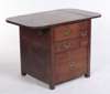 the rounded rectangular drop flap top above an arrangement of three short drawers and one deep drawer, with recessed brass handles and iron loop carrying handles, on stem feet