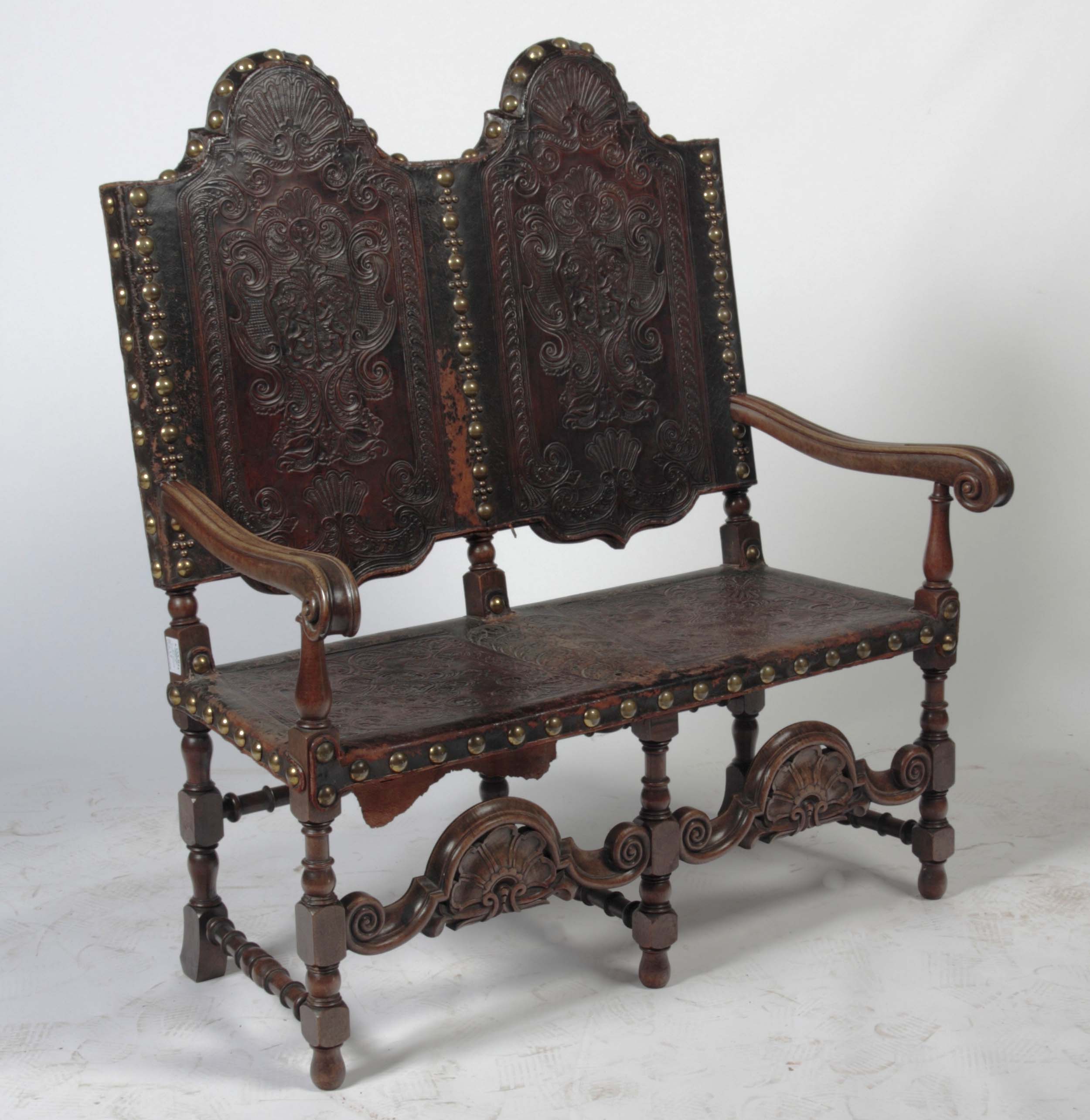 the double arched studded and floral embossed leather back above a similarly upholstered seat flanked by scrolling arms, on turned legs united by shell carved front stretchers
