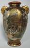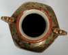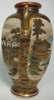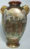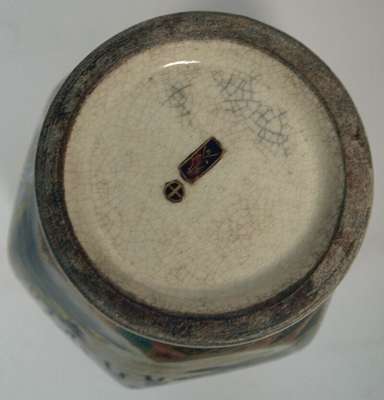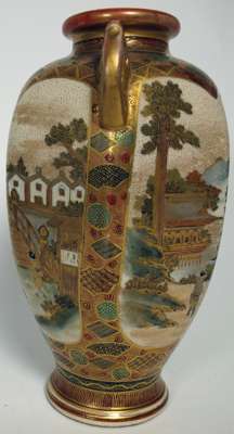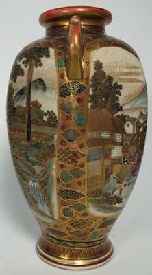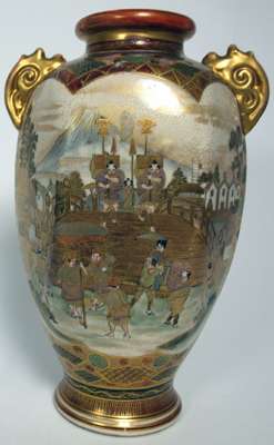 of hexagonal baluster form with scroll handles, painted to one side with processional figures crossing a bridge and to the other with figures in a landscape, with a geometric border, two character mark
