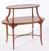 of oval form with two graduated tiers, the top decorated with floral arabesques on inlaid splayed square section legs headed by angle frets, the whole decorated with box and ebony lines