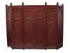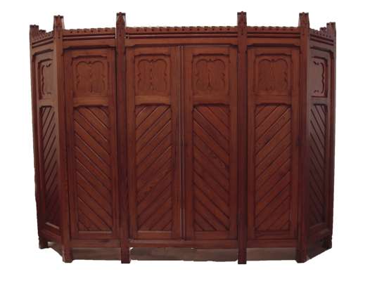 of rectangular form, with canted sides, the raised crocket uprights with sunken maple leaf decoration above chamfered and slatted doors and similar side doors enclosing fitted and hanging interiors, on chamfered stem feet
