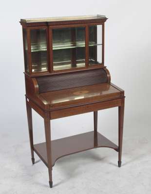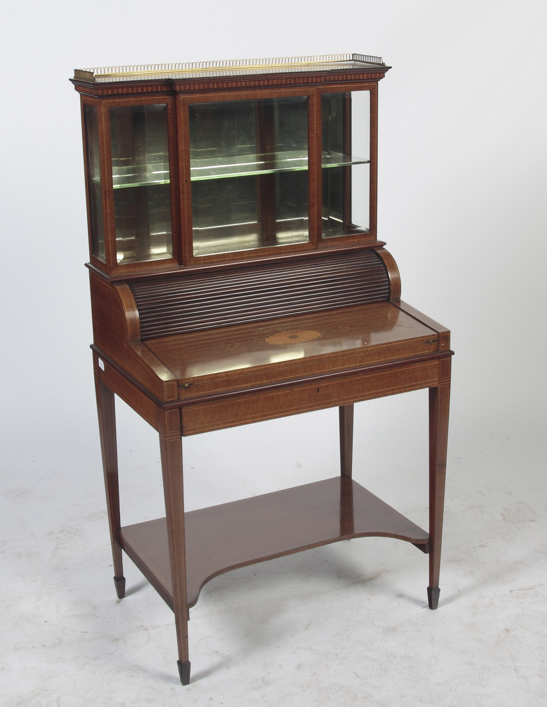 the glazed top with display shelf and mirror back below a gilt metal gallery, the fan inlaid fall with fallout writing slope and fitted interior, the frieze drawer rising a rear tambour to reveal three stage drawers, on square tapered legs; spade feet united by an undershelf