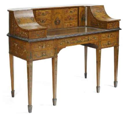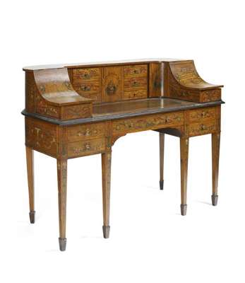 the wrap around stage back with two banks of three short drawers flanked by three small cupboard doors and drop hinged stationery cupboards enclosing fitted drawers above a gilt tooled tan skiver, with forward sliding action, the kneehole with a frieze drawer flanked by two short drawers to each side, on square tapering legs ending in spade feet, the whole painted with peasant girls and neo-classical floral decoration around trophies of the Arts and Music