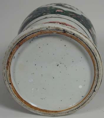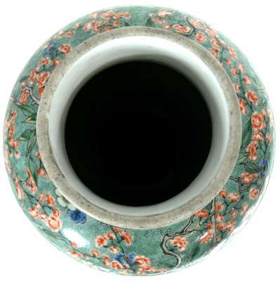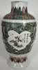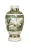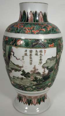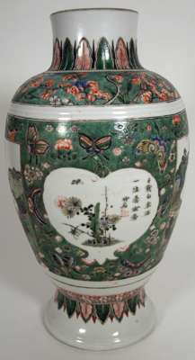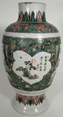 of baluster form, decorated to the shoulders with scrolling prunus blossom and to the body with alternate square panels depicting figures within a landscape and cartouche panels containing flowers and foliage, each panel with Chinese text, framed by flowers and butterflies, all between stiff leaf borders
