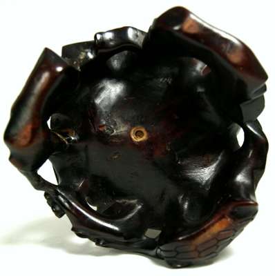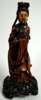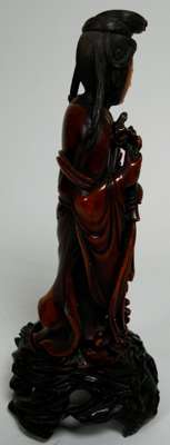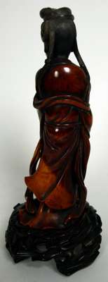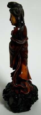 holding a rustic sceptre and an overturned water jar, on foliate carved hardwood stand