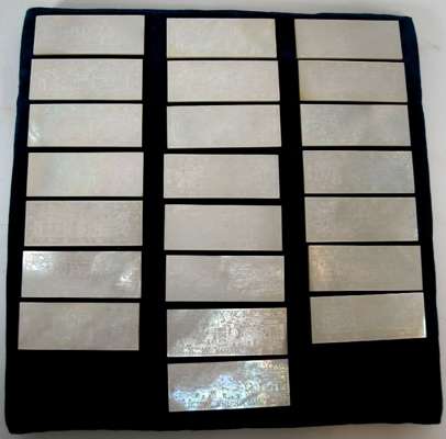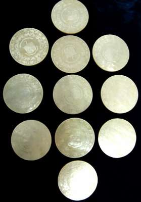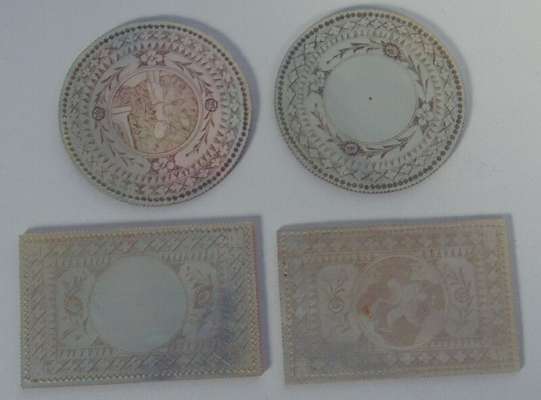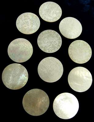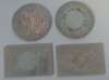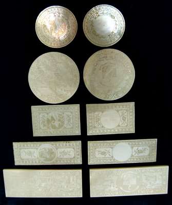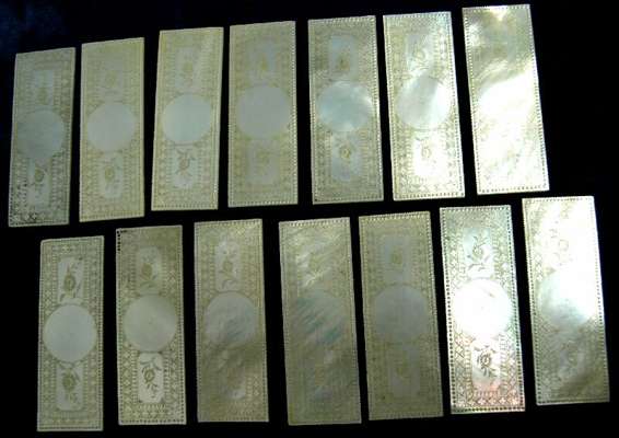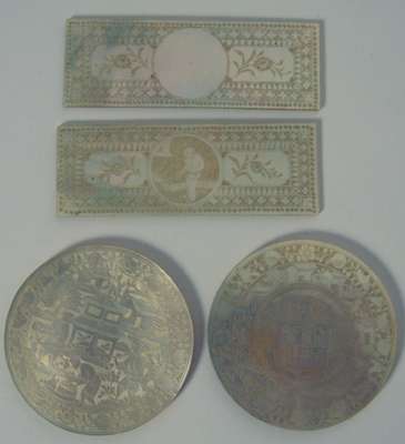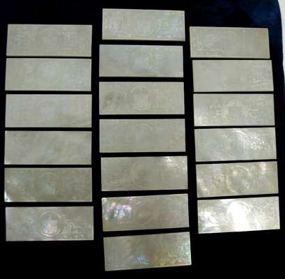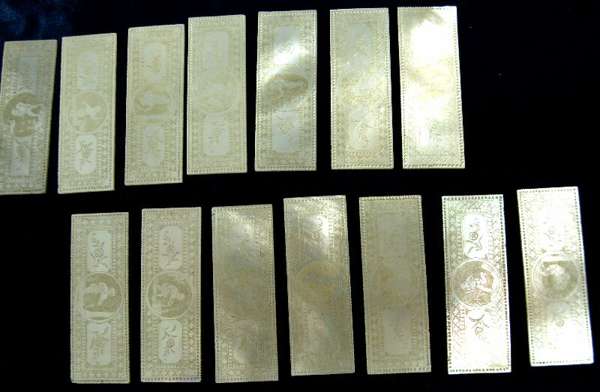 decorated with a central armorial and the motto 'Endure furth/Lux in Tenebris'' flanked by birds beside buildings, the reverse decorated with Chinese figures in front of houses, each side with floral border, comprising: sixty-one rectangular, 7cm x 1.7cm and eleven circular, 4.1cm diameter; together with another set decorated with a central Chinese figure within a roundel with flowers and a geometric border, comprising: thirty rectangular, 6cm x 2.1cm; two rectangular, 4cm x 2.6cm and seven circular, 3.4cm diameter (111)