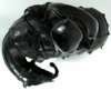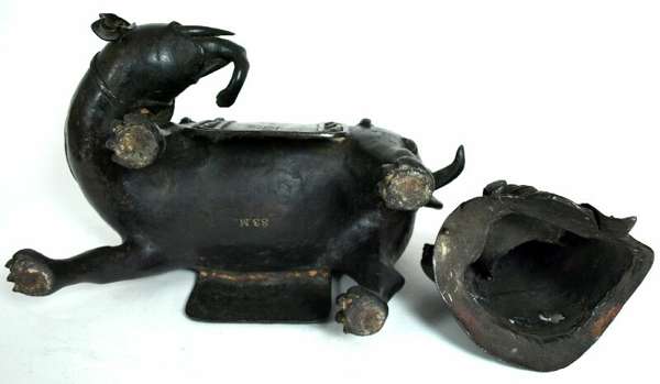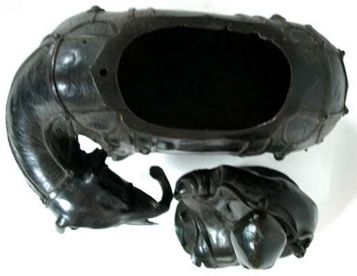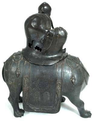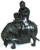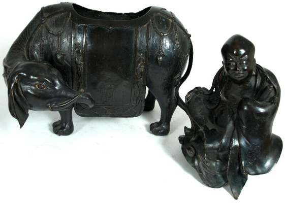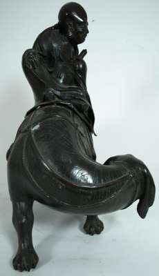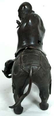 clasping a scroll in his left arm and sitting cross legged atop the elephant which has his head turned to the left, with relief characters to the saddlecloth