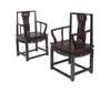 the rectangular backs with panel splats pierced and carved with ornamental scrolls above shaped open arms with pierced central struts and panelled seats with pierced and foliate carved aprons, on moulded square section legs united by perimeter stretchers, each finished in red-brown lacquer (2)