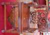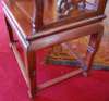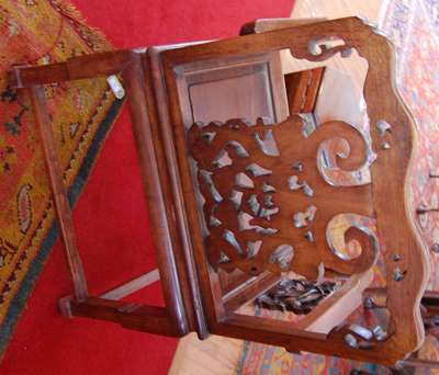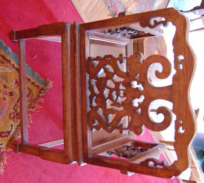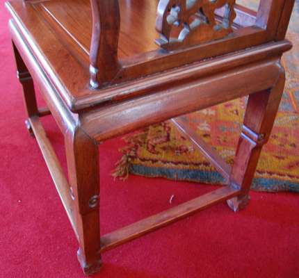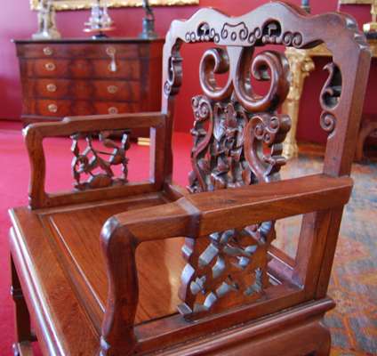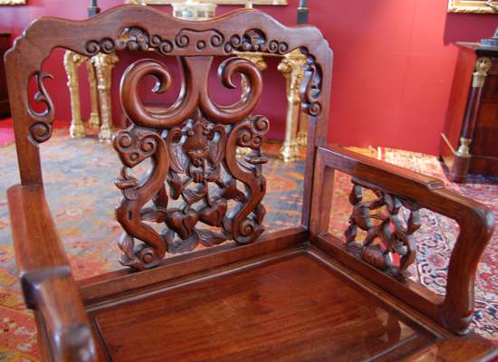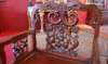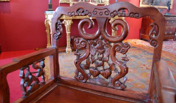 the serpentine top rails above shaped splats carved with bats and fruit, the arms similarly carved, the panelled seat on angular cabriole legs (2)