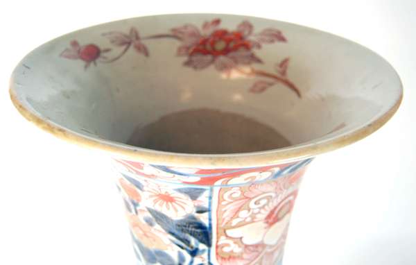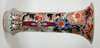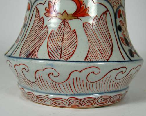 with flared neck above cylindrical body, decorated with panels of flowers, foliage and cranes