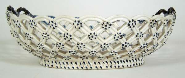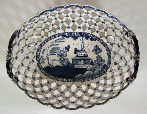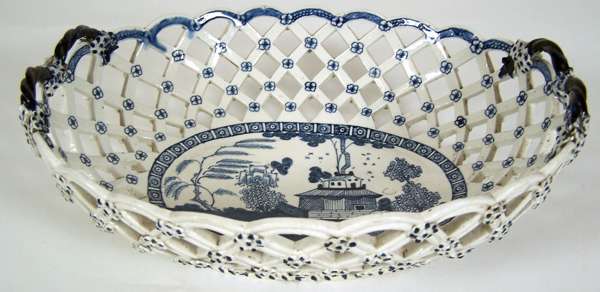 painted to the well with an oval chinoiserie scene of a pavilion and trees, ribbon twist handles, unmarked, circa 1785, old paper label