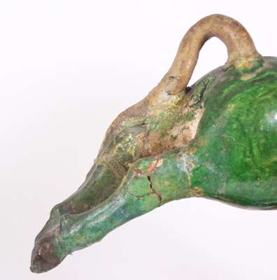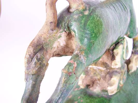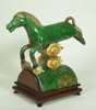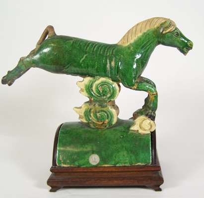 in the form of a leaping horse on clouds, sancai glazed in green, yellow and white, on a wood stand