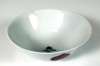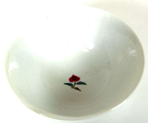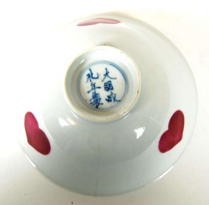 with three red peaches, the inside with a single red peach on a leafy stem, the base with a six character Cheng hua mark within a double ring, with wood stand