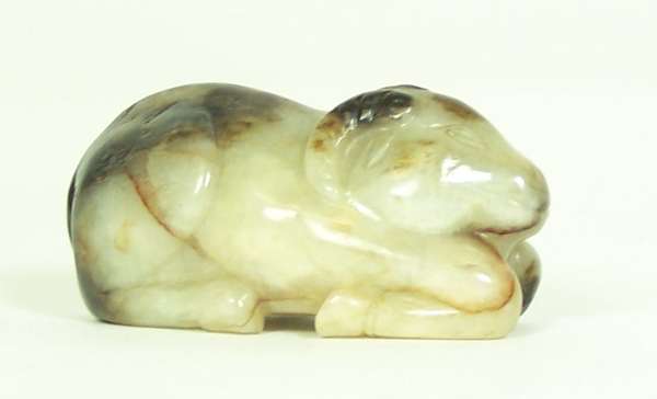 A Chinese pale and dark brown jade ram, Qing Dynasty