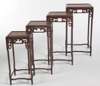 the graduated square tray tops with open fretted scrolls, on shaped and turned legs united by perimeter stretchers and ending in ball feet