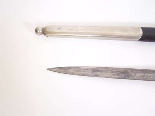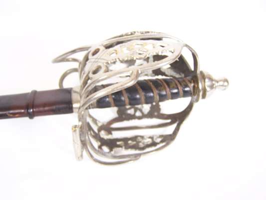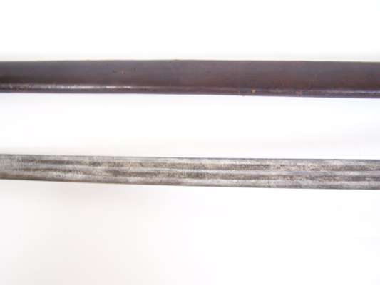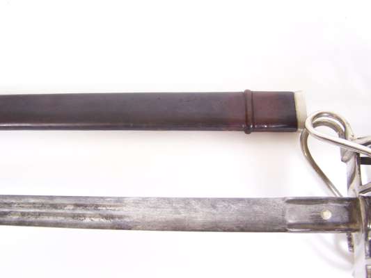 the leather grip bound with a double twist of silver wire, the hilt of plated brass, original leather scabbard with matching mounts