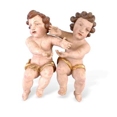 A pair of 17th/18th century South German or Austrian carved wood and polychrome figures of cherubs