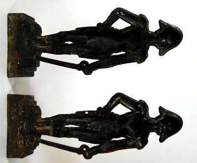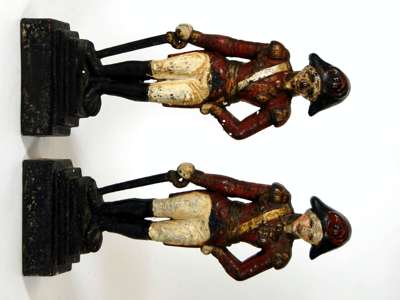 each in dress uniforms with fringed epaulettes and bicorn hats and holding a sword, on stepped plinth bases (2)