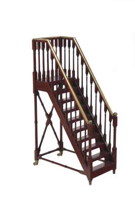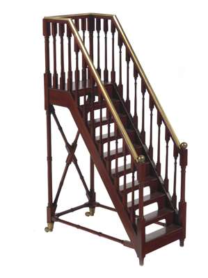 with applied brass banister rails above columnar balustrades and arched steps, on ring turned supports and the rear legs with brass caps and castors