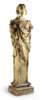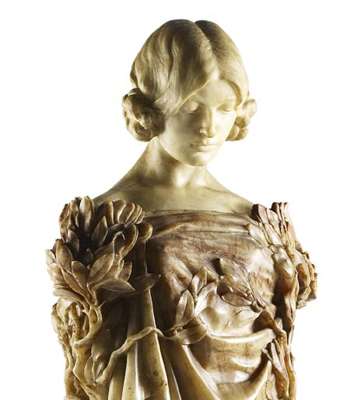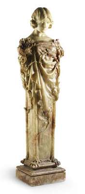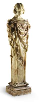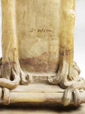 alabaster herm, naturalistically carved with her soulful face looking down at the berried laurel tendrils enveloping the flared square stem, on a moulded square plinth base, signed lower right side S. Wiens/Sculpst /1919